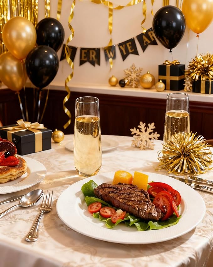 - Food-Grade: These plastic champagne flutes are safe for you and your guests; Disposable champagne flutes are made of food-grade plastic; Thickened plastic material makes the plastic champagne glasses more sturdy and not easy to warp.