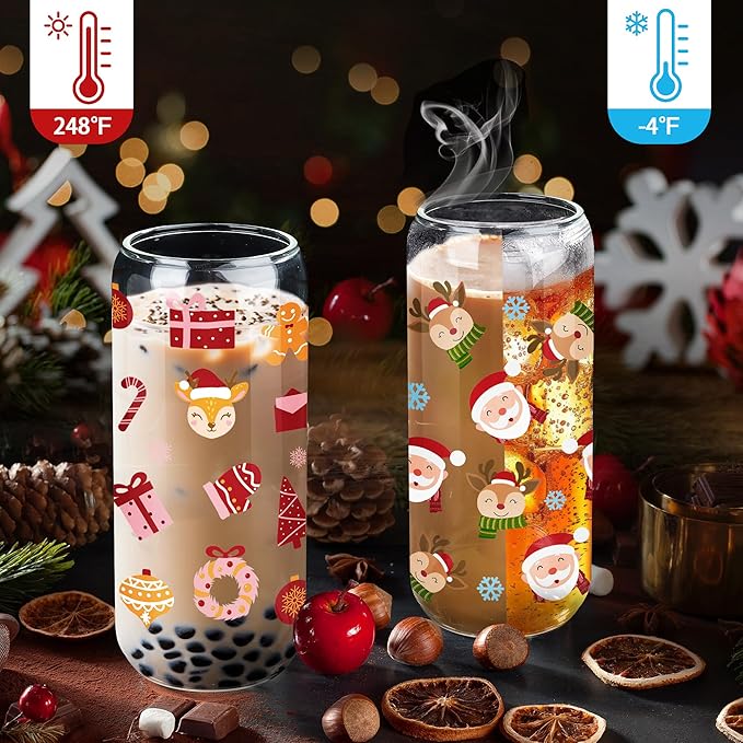 Joeyan Christmas Glass Cups with Lids and Straws,20 oz Iced Coffee Tumbler with Santa Claus and Elk Patterns,Cute Can Shaped Beer Drinking Glasses,Holiday Gifts for Women Mom Friend