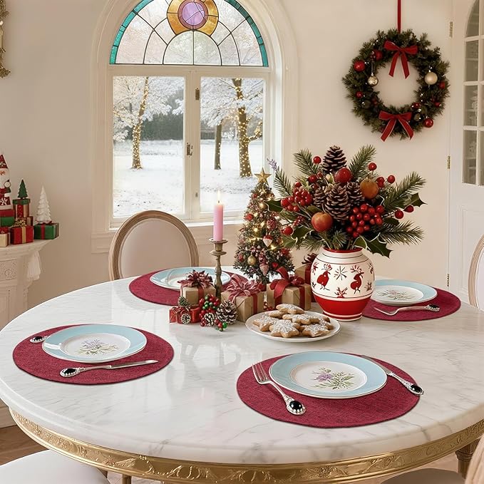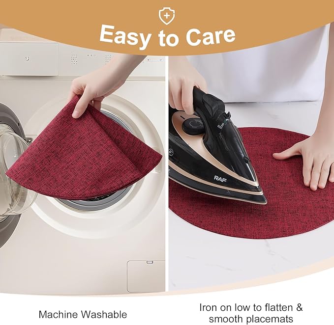 homing 15 Inch Round Cloth Placemats Set of 6, Cotton Linen Blend Washable Table Mats, Farmhouse Dining Place Mats for Indoors & Outdoors, Easy to Clean, Red