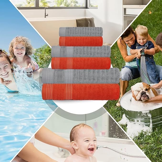 CASA COPENHAGEN Elegance 6 Pieces Towel Set- Orange + Grey Violet, 550 GSM 2 Bath Towel 2 Hand Towel 2 Washcloth, Designed in Denmark Made of Soft Egyptian Cotton for Bathroom, Kitchen & Shower