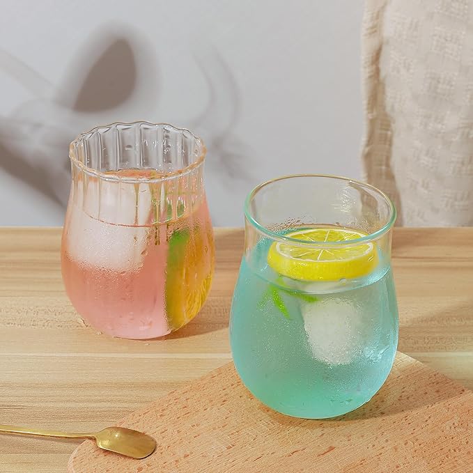 Koythin 2-Piece Ribbed Glass Cups, Vintage Drinking Glassware for Iced Coffee Juice Cocktails Milk Tea Beer, 10 oz/300 ml Cute Bubble Cup with Rounded Shape (Oval Tulip)