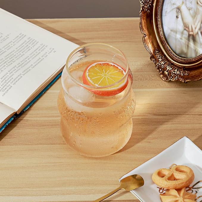 Koythin 2-Piece Ribbed Glass Cups, Vintage Drinking Glassware for Iced Coffee Juice Cocktails Milk Tea Beer, 16 oz/460 ml Cute Bubble Cup with Wave Shape (Cloudy Chubby)