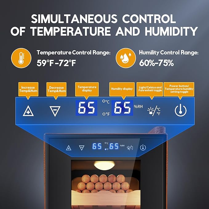 - 【Auto Control of Temp and Humidity】Our cigar humidor cabinet has a temperature control range of 59-72°F (15-22°C) and a humidity control range of 60%-75%. Built-in large capacity water tank with a thick sponge, so you don't need to refill water frequently. Energy-saving design, power consumption is<0.25 kWh/24 hours, cost is<$0.05/day.