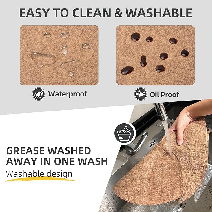 - [EASY TO CLEAN]: Designed for real-life messes, these vinyl placemats are waterproof, oilproof, and washable by hand or machine. The table mats are resistant to scratches and stains, which makes them a great choice in homes with small kids, it also works great as a pet food mat, a charging plates, and more