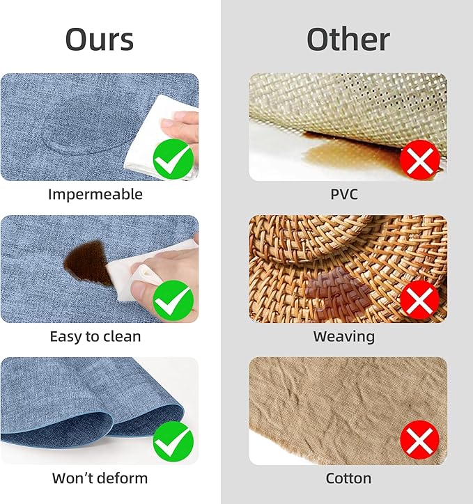 - [EASY TO CLEAN]: Designed for real-life messes, these vinyl placemats are waterproof, oilproof, and washable by hand or machine. The table mats are resistant to scratches and stains, which makes them a great choice in homes with small kids, it also works great as a pet food mat, a charging plates, and more