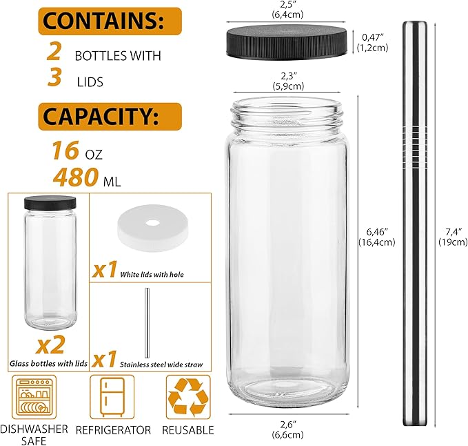 Glass Juice Bottles with Lids and Straws, 16 Oz - Set of 2 Reusable Clear Cups - For Drinking Smoothie, Iced Coffee, Juicing, Matcha, Water, Kombucha and More