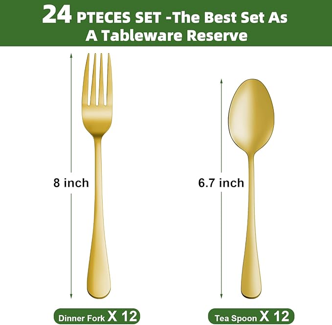 24 Pcs Gold Forks and Spoons Silverware Set, Food Grade Stainless Steel Flatware Cutlery Set for Kitchen and Restaurant, 12 Dinner Fork(8") and 12 Teaspoon(6.7"), Mirror Polished, Dishwasher Safe