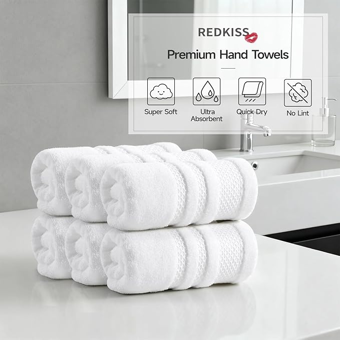 REDKISS Premium White Hand Towels for Bathroom, 13 x 30 inch, 100% Cotton Hand Towel Set of 6, Super Soft and Highly Absorbent Towels for Bathroom, Gym, Spa, Shower, and Hotel
