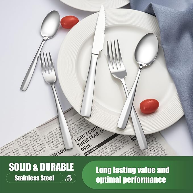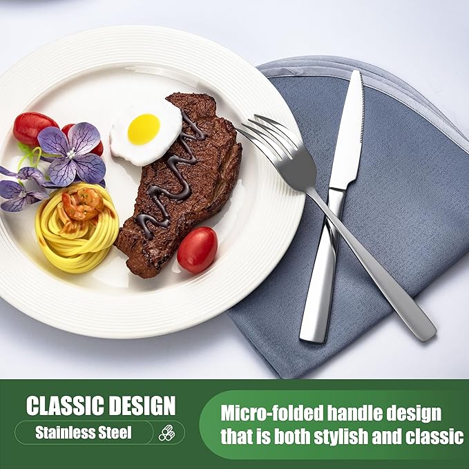 - 【ELEGANT MODERN DESIGN】This cutlery set features a micro-folded handle design that is both stylish and classic, highly mirror polished, smooth edges without burrs, moderate weight, and perfect balance. It is both beautiful and practical, and can be perfectly matched with any of your existing tableware.