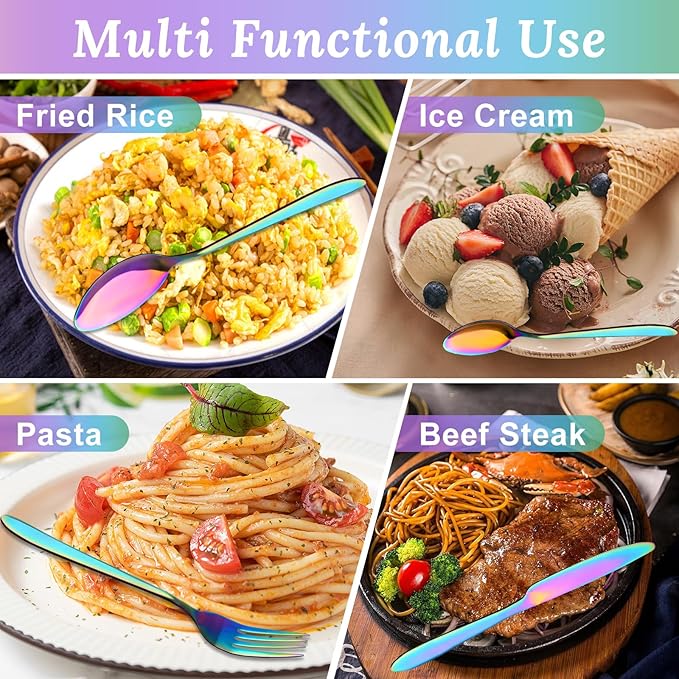 - 【Multi-functional Set】 The set of 16PCS rainbow colored tableware, including 4PCS knives, 4 PCS spoons, 4 PCS forks, and 4 PCS teaspoons, providing all the basic utensils needed for a complete dining experience. Whether you're enjoying steak, salad, stirring coffee, or savoring desserts, you can find the right utensils