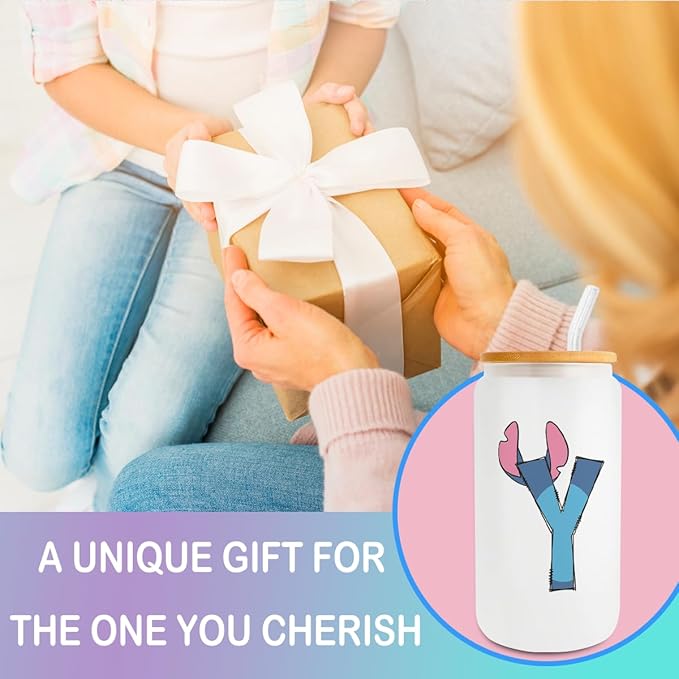 Cute Cartoon Lover Gifts Initial A-Z Personalized Iced Coffee Cup Cartoon Merch 16oz Glass Cup with Lid and Straws Birthday Christmas Gifts for Women Teen Girls Fans (Letter Y)