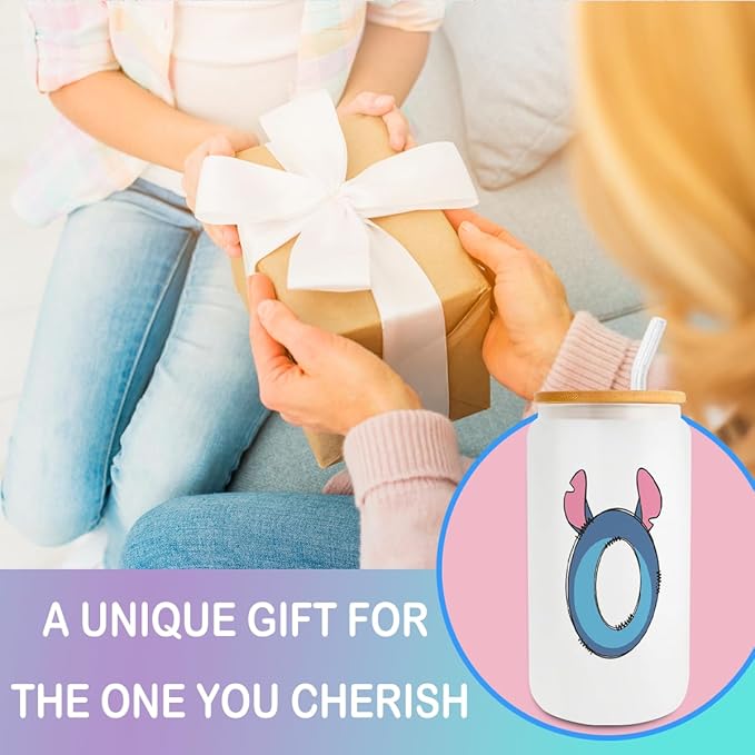 Cute Cartoon Lover Gifts Initial A-Z Personalized Iced Coffee Cup Cartoon Merch 16oz Glass Cup with Lid and Straws Birthday Christmas Gifts for Women Teen Girls Fans (Letter O)