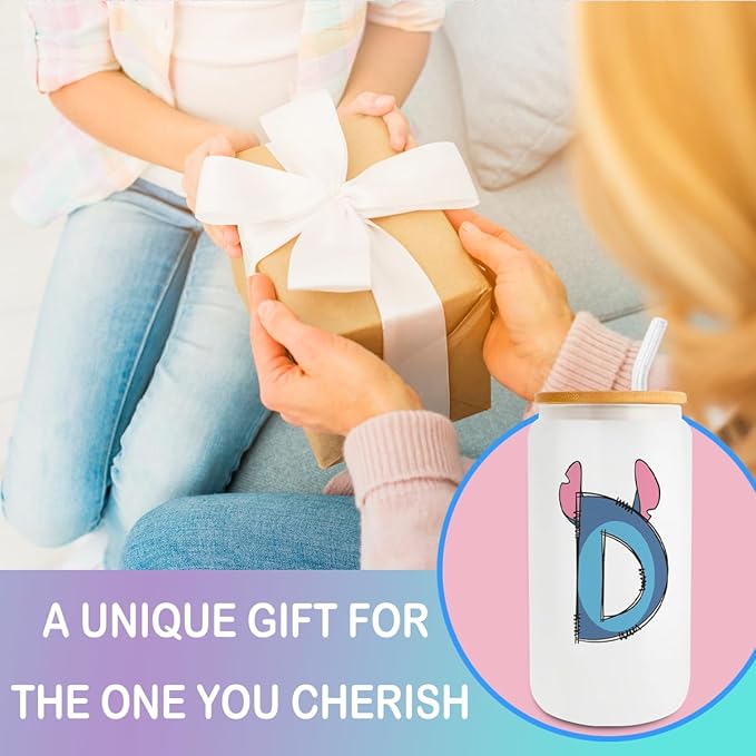 Cute Cartoon Lover Gifts Initial A-Z Personalized Iced Coffee Cup Cartoon Merch 16oz Glass Cup with Lid and Straws Birthday Christmas Gifts for Women Teen Girls Fans (Letter D)