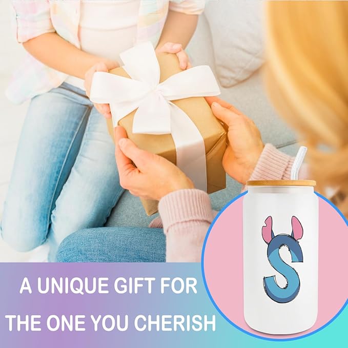 Cute Cartoon Lover Gifts Initial A-Z Personalized Iced Coffee Cup Cartoon Merch 16oz Glass Cup with Lid and Straws Birthday Christmas Gifts for Women Teen Girls Fans (Letter S)