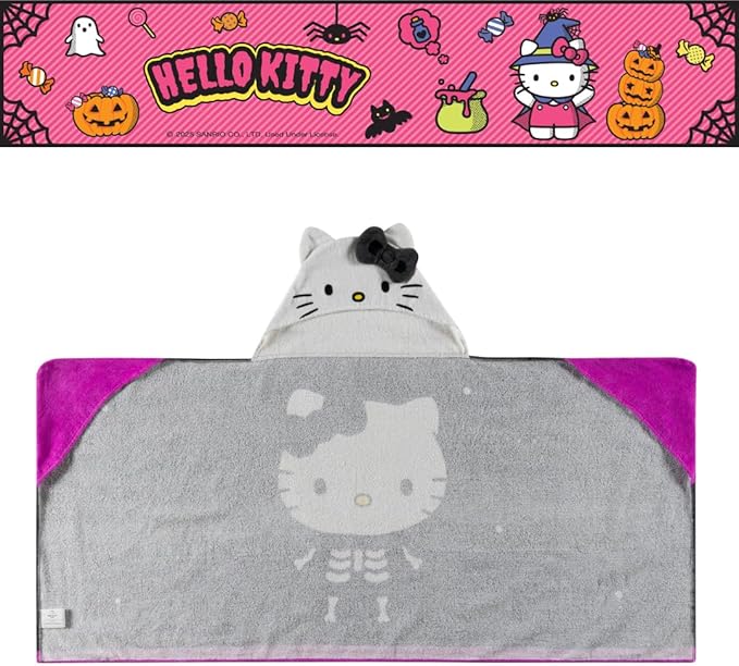 - HELLO KITTY SKELETON DESIGN:Make bath time spooky-cute with this Hello Kitty hooded towel wrap! Featuring Hello Kitty in a skeleton costume with bats, stars, and a dangling spider, this soft cotton wrap is perfect for Halloween fun at home, pool, or beach.