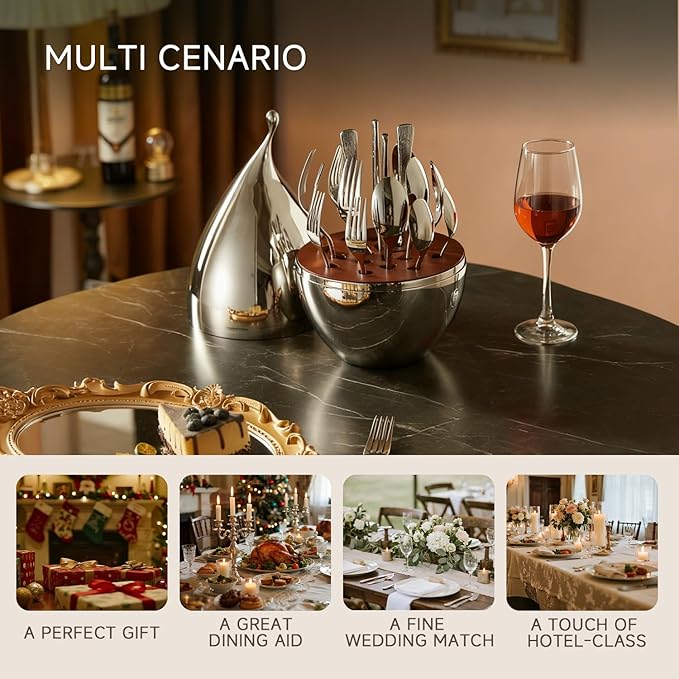 - Premium Craftsmanship: Flatware Set withWaterdrop Storage Organizer are all made Handcrafted from mirror-polished stainless steel for a stunning, silver-like shine.The storage capsule inside haveblack walnut wood adds a touch of sophistication and contrasts beautifully with the gleaming cutlery