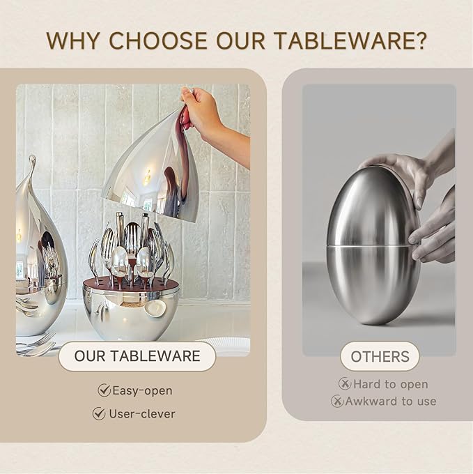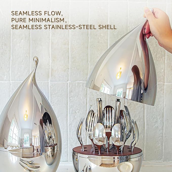 - Premium Craftsmanship: Flatware Set withWaterdrop Storage Organizer are all made Handcrafted from mirror-polished stainless steel for a stunning, silver-like shine.The storage capsule inside haveblack walnut wood adds a touch of sophistication and contrasts beautifully with the gleaming cutlery.