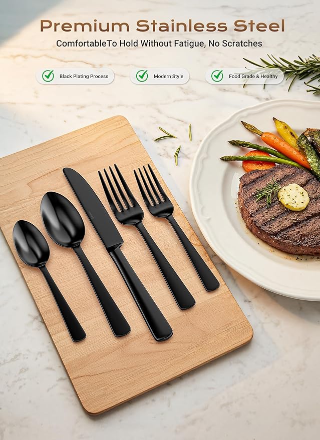- Ergonomic Design Size and Weight: Each piece of black stainless steel silverware set is meticulously crafted with a streamlined body molding, rounded flat-edge ends, curved handles, and proper weight and size, ensuring a comfortable grip that makes dining effortlessly enjoyable, even during prolonged use.