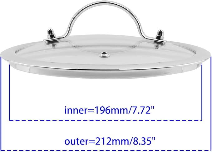 - Size:The lid fits pot with an outer diameter less than 212mm/8.35" and inner diameter greater than 196mm/7.72".Before purchasing, please measure your cooking utensils.All the dimensions are measured manually and there might be slight deviations