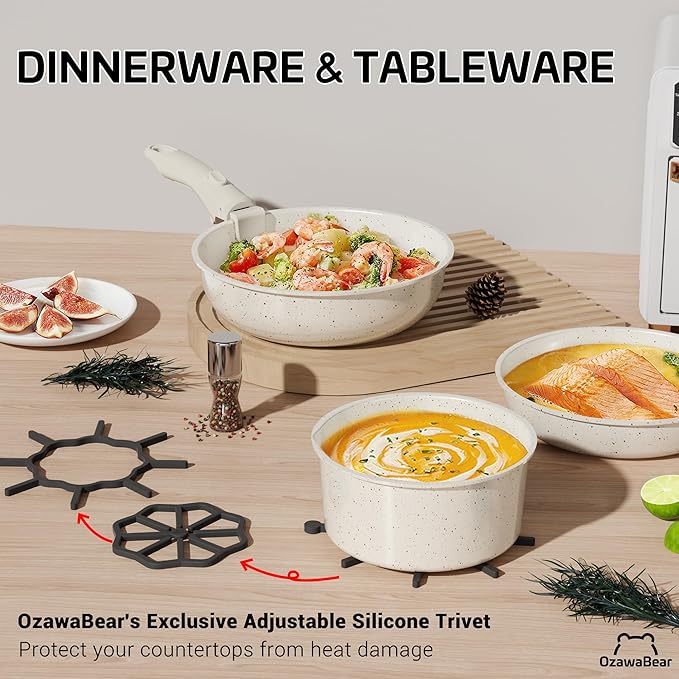 - Functional Cookware Set: Use as tableware, bakeware, dinnerware, grill pans, or fridge storage (with lid). Includes OzawaBear's exclusive adjustable silicone trivet to protect your countertops from heat damage.
