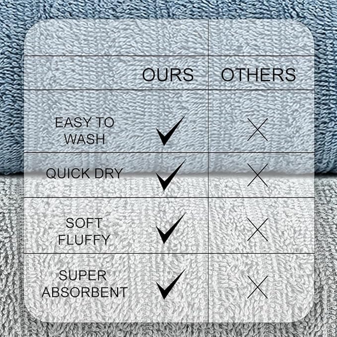 - INGREDIENT: Set contains 2 Large Bath Towels of 27x55 Inches, 2 Large Hand Towels of 16x28 Inches, 2 Washcloths of 12x12 Inches.