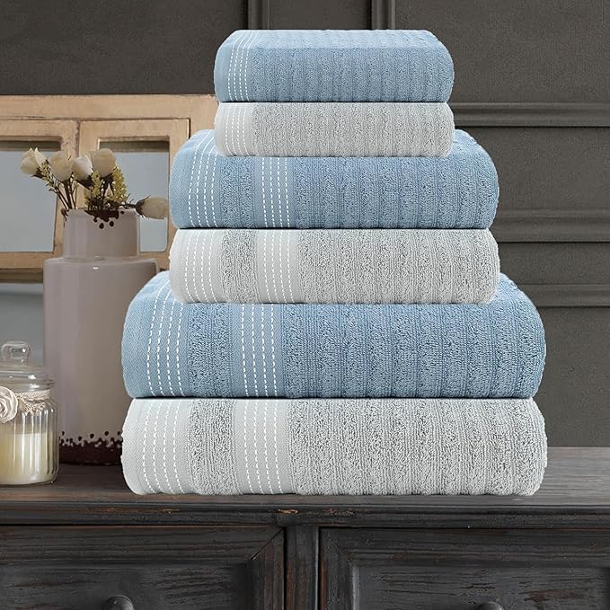 CASA COPENHAGEN Elegance 6 Pieces Towel Set- Grey Violet + Dusty Blue, 550 GSM 2 Bath Towel 2 Hand Towel 2 Washcloth, Designed in Denmark Made of Soft Egyptian Cotton for Bathroom,Kitchen and Shower