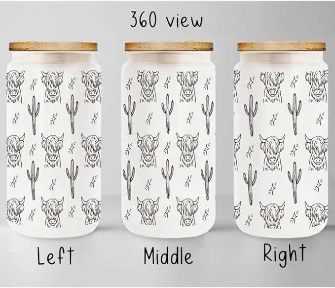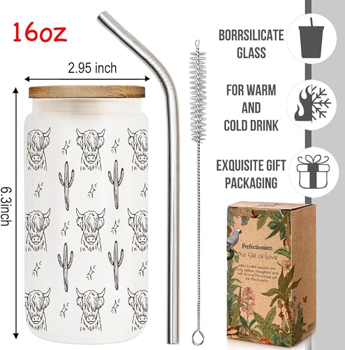 Cute Highland Cow Print 16oz Coffee Cup Gifts for Cow Lovers Women Sister, Glass Cups with Lids and Straws Gift for Perfect for Friend New Mom, Mother in Law, Step Bonus,Birthday