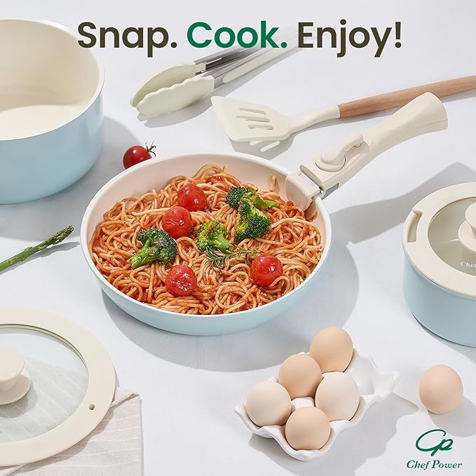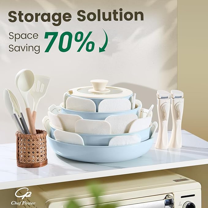 - Easy To Store - Chef Power removable cookware set makes kitchen storage simple, easy to stack and saves 70% space.