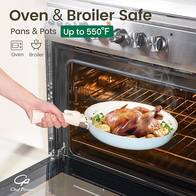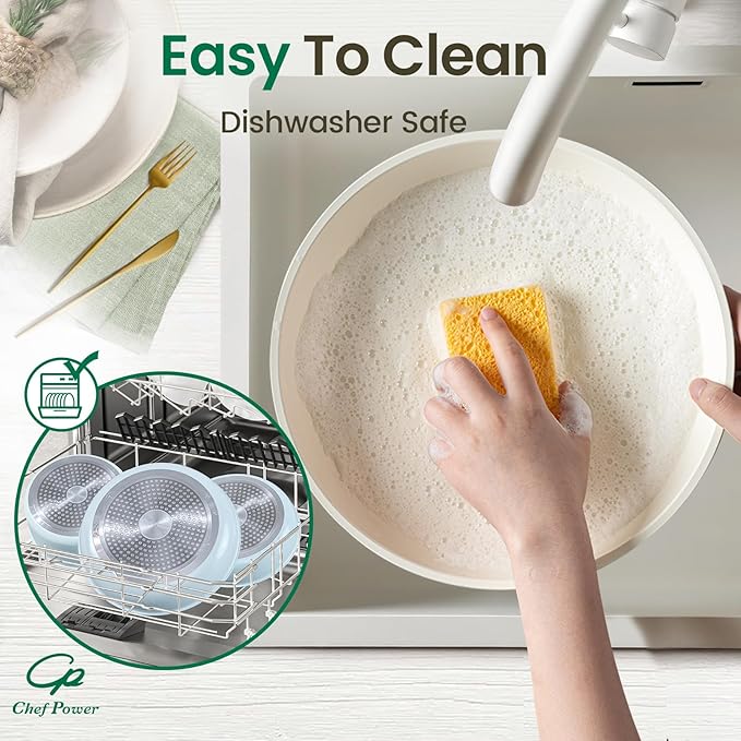 - Easy To Clean - Chef Power pans and pots set is designed with ceramic nonstick throughout, support dishwasher and handwash.