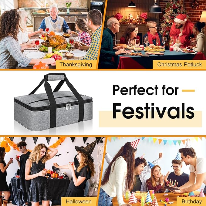 - Details: The casserole dish carrier bag adopt double zipper design, easy to open and close; The internal aluminum film not only holds heat but easy wiped clean with paper towels when encountering dirt; Note: Not machine washable