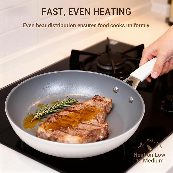 - Effortless Non-Stick & Easy Cleaning: Advanced ceramic nonstick coating delivers smooth food release for stress-free cooking; Perfect for delicate dishes like eggs or pancakes; Cleanup is effortless since this kitchen cookware set is dishwasher safe or easily wipes clean with a damp cloth, saving you precious time after every meal