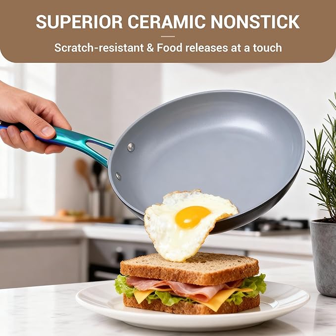 - Ceramic Nonstick Coating:The Ammeloo ceramic cookware set makes cooking effortless with its advanced nonstick surface, along with a durable, scratch-and-stain-resistant coating for lasting performance.This pots and pans set non stick requires less oil for healthier, low-fat meals.