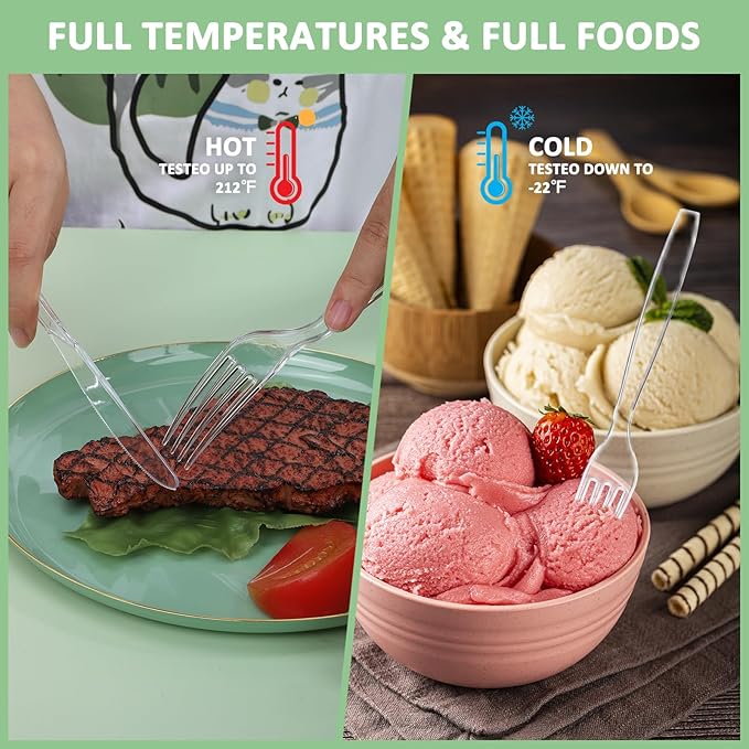- 【BPA-Free Disposable Silverware】 Enjoy every bite with peace of mind. Crafted from 100% food grade materials, our plastic cutlery is completely safe for children and adults alike. The crystal-clear design adds a touch of elegance to your table. Withstanding temperatures from -22 ℉ to 100 ℉, you can confidently use it for hot meals or ice cream without a second thought.
