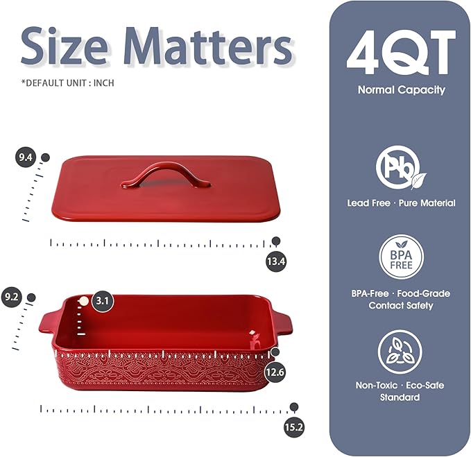 - Versatile Casserole Dish: 9x13 inch ceramic dish with lid (4.5-quart) for baking, roasting, and serving. Great for lasagna, casseroles, meats, and cakes. Deep design prevents overflow; lid locks in moisture for tender dishes.