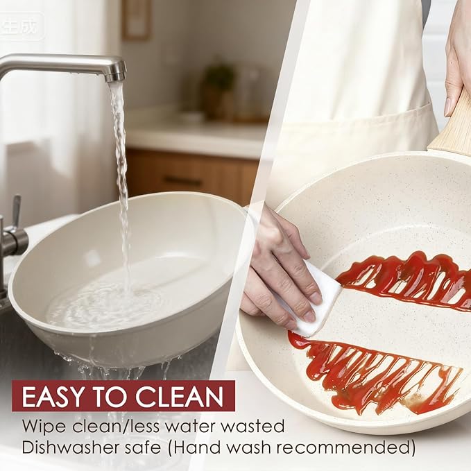 - 【Easy to Maintain】After cooking and food preparation, simply clean with warm water and a soft sponge or cloth, reducing water waste. The cookware is also dishwasher-safe for quick cleaning, though handwashing is recommended to extend its lifespan
