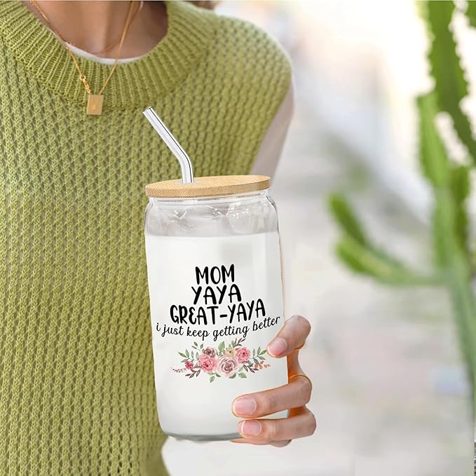 Christmas Grandma Gifts For Mom Yaya Great Yaya Glass Coffee Cup With Lid And Straws 14oz - christmas Glass Cup gifts For Grandmother