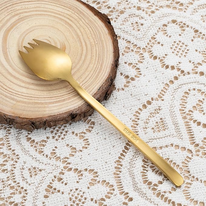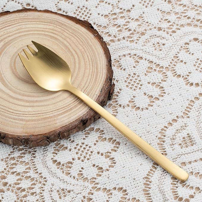 - โจ Ergonomic Design for Comfort and Functionality The serving spoon and fork are designed with ergonomically rounded handles for a secure and comfortable grip. The spoon is ideal for serving liquids, while the fork securely holds salad leaves and pasta. The smaller forks feature a clever curved design, making them versatile for everything from ice cream and soup to noodles and fruit.