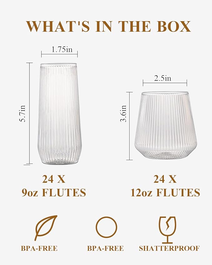 - ALL-IN-ONE VERSATILE SET FOR EVERY OCCASION Get 48 pieces of elegant drinkware in one pack—24 stemless 9oz champagne flutes and 24 ribbed 12oz cups. No need to buy separate sets; it meets all your serving needs for weddings, bridal showers, brunch, or backyard barbecues, saving you time and money.