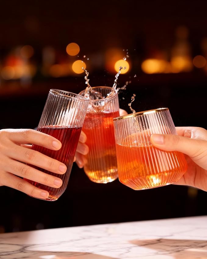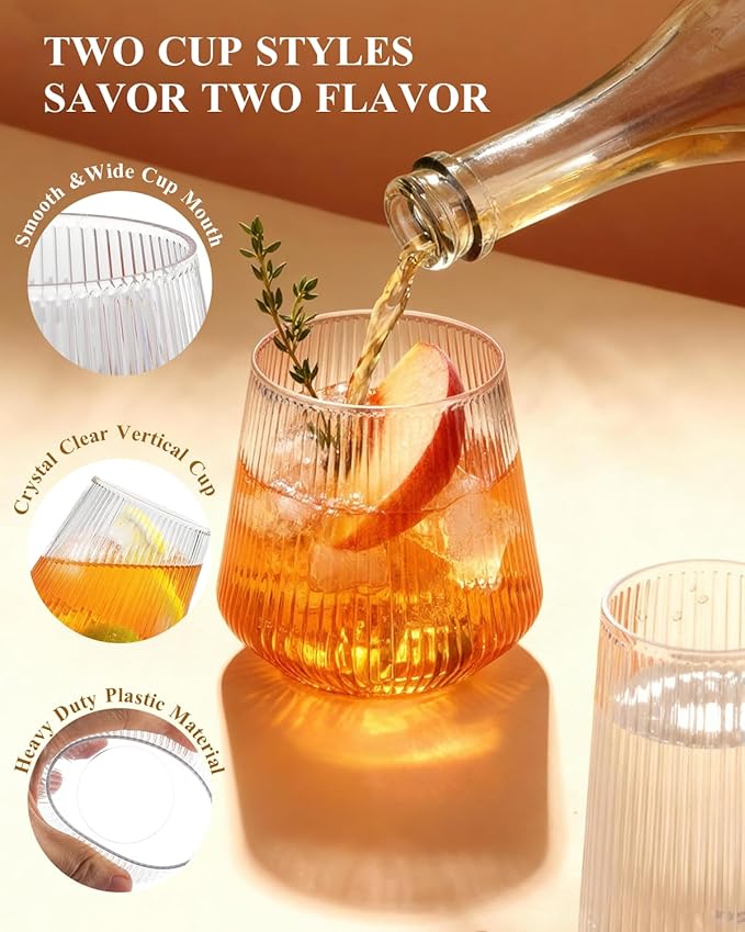 - ELEGANT RIBBED DESIGN BOOSTS EVENT STYLE Features a unique origami ripple ribbed pattern that adds a sophisticated, modern touch to your table setting. The clear design mimics the luxury of real glass, making your drinks look more appealing—great for upgrading the vibe of weddings, cocktail parties, or holiday brunches without the high cost of glassware.
