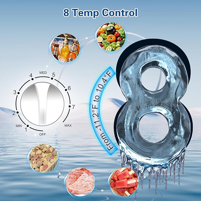 - 【8 Temperature Control Adjustment】This commercial Freezer has a thermostat. Can be controlled from -11.2F~10.4F, (strong Down to -12°F) chest freezer has 8 gears adjustable temperature control allowing you to manage and customize your desired temperature. for precise temperature control. Of course, if you need to freeze fresh food, adjust the knob to "strong" for quick freezing.