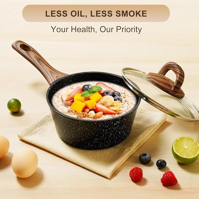- GLASS LID & STAY-COOL HANDLE: The anti-scald wood-grain Bakelite handle is ergonomically designed for comfort and ease of handling. The tempered glass lid allows you to monitor the cooking process conveniently and prevents splashes on your stove.