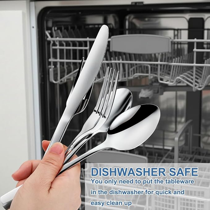 - 【DISHWASHER SAFE & EASY TO CLEAN】For everyday care, these silverware sets are dishwasher safe. To best preserve the pristine mirror finish long-term, we recommend a gentle hand wash with mild dish soap. Avoiding abrasive cleaners or scouring pads will keep the sleek surface looking as new as the day you bought it.