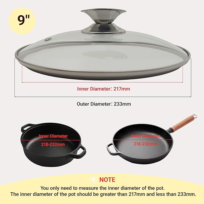 - Universal Compatibility: This universal pot lid (9in, outer:233mm/9.17in, inner:217mm/8.54in) fits all pots, pans, frying pans, woks. No more searching for lids—this one meets all needs, saving space and money.