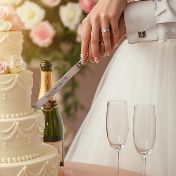 - Elegant Wedding Cake Cutting Set: This silver 4 piece wedding cake knife and server set includes a knife engraved with “Happily Ever After”, a server engraved with “Forever Starts Today”, and two forks engraved with “Bride” and “Groom.” A timeless keepsake for weddings, anniversaries, and engagements.