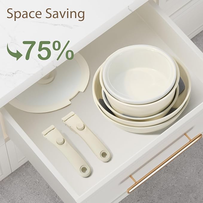 - 【Space-Saving Design】Using this detachable handle pots and pans set,free up valuable cabinet space with our detachable handle system. Stack and store your cookware neatly—saving up to 70% more room compared to traditional pots and pans.