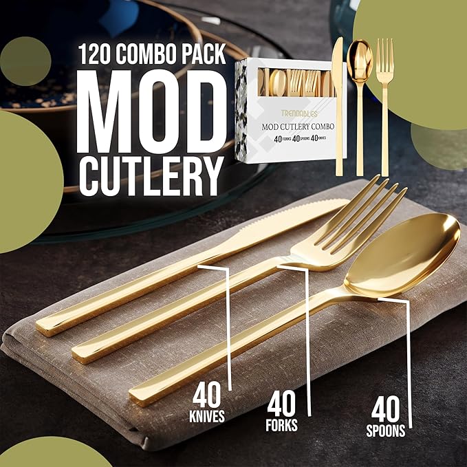 - PERFECT FOR ANY OCCASION: Introducing Our Designer Sleek, Modern, And Stylish Disposable Cutlery gold flatware - This Trendy Cutlery Is Perfect For weddings , Receptions , Formal Dinners , Banquets , Parties Picnics, Catering Supplies , Halloween , Christmas Etc