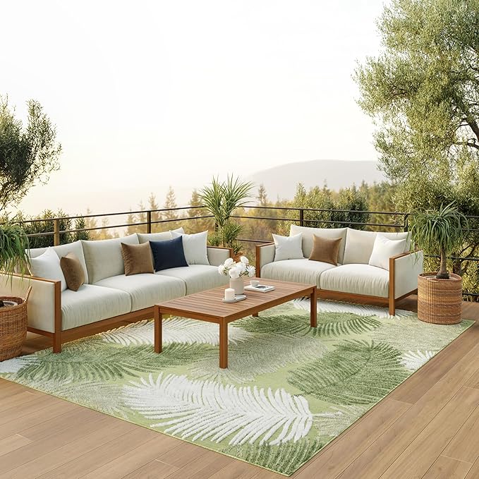 - Botanical leaf indoor/outdoor rug adds a fun pop of pattern