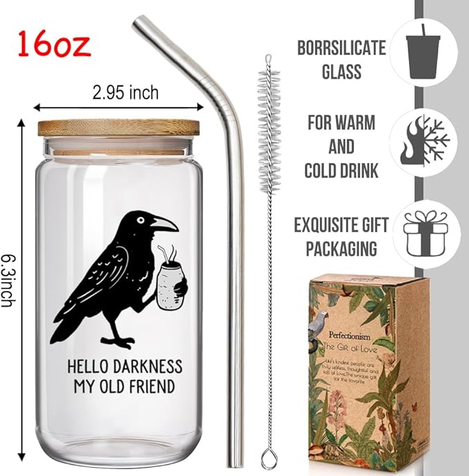 Funny Cawfee 16oz Glass Cup with Lid and Straw Gifts for Bird Lovers - Hello Darkness My Old Friend, Spooky Halloween Vintage Crow Coffee Cup Perfect for Crow and Coffee Lovers