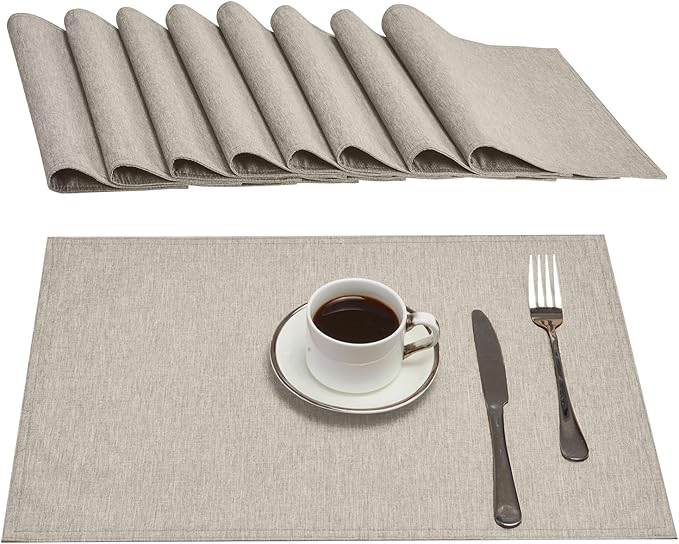 Cloth Place Mats Set of 8–Reusable Rectangular Waterproof Fabric Polyester Washable Wipeable Heat Resistant Linen for Kitchen Dining Dinner Restaurant Wedding Table(Flaxen/13x19 Inch)