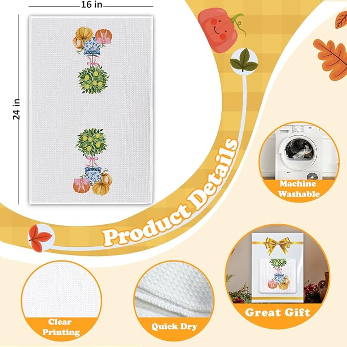 - Product Size: Each chinoiserie pumpkin towel measures 16 x 23.5 inches, a practical size for fall kitchen towels, fall hand towels for bathroom, and farmhouse kitchen decor.